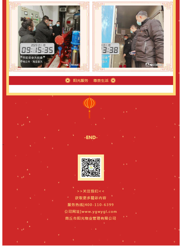 陽(yáng)光物業(yè)成立于2003年5月,專注物業(yè)服務(wù)行業(yè)20余載,陽(yáng)光物業(yè)現(xiàn)為河南省物業(yè)管理協(xié)會(huì)副會(huì)長(zhǎng)單位、商丘市物業(yè)管理協(xié)會(huì)副會(huì)長(zhǎng)單位,公司注冊(cè)資金1020萬(wàn)元,陽(yáng)光物業(yè)連續(xù)多年被河南省及商丘市評(píng)為先進(jìn)企業(yè)、優(yōu)秀企業(yè)。