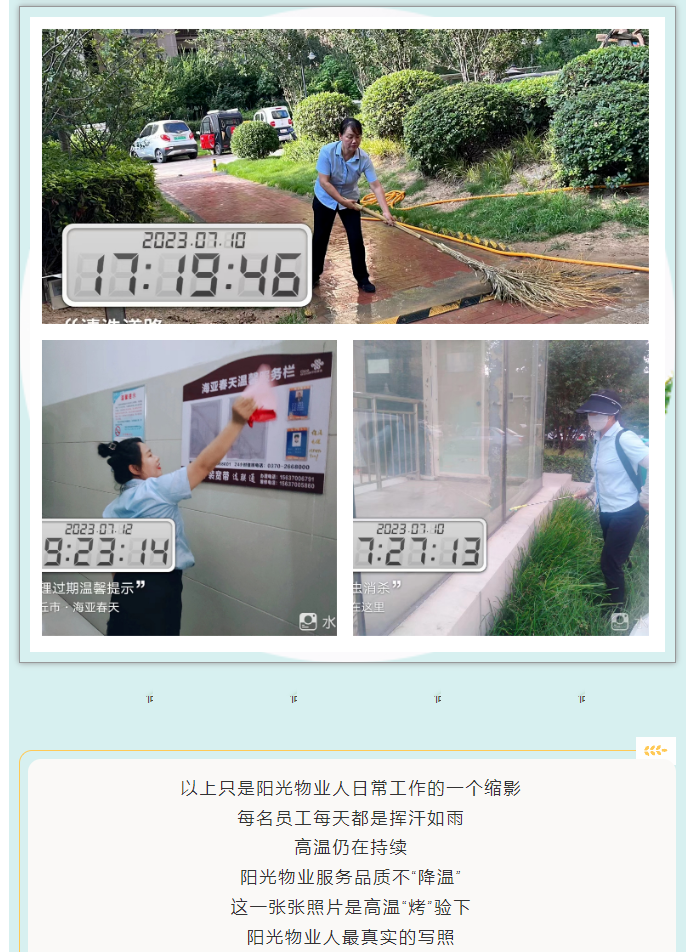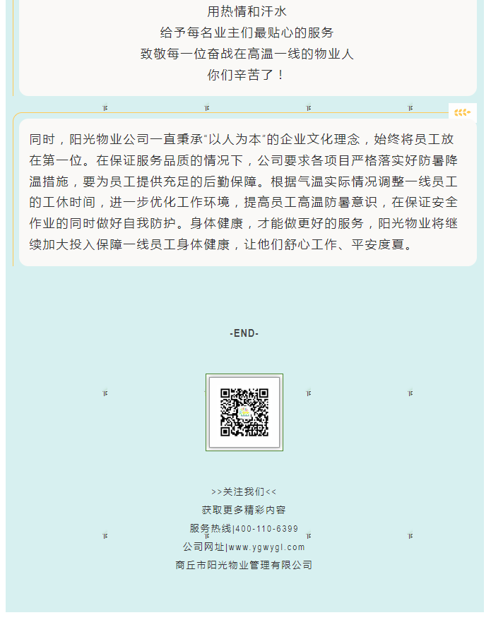 陽(yáng)光物業(yè)成立于2003年5月,專注物業(yè)服務(wù)行業(yè)20余載,陽(yáng)光物業(yè)現(xiàn)為河南省物業(yè)管理協(xié)會(huì)副會(huì)長(zhǎng)單位、商丘市物業(yè)管理協(xié)會(huì)副會(huì)長(zhǎng)單位,公司注冊(cè)資金1020萬(wàn)元,陽(yáng)光物業(yè)連續(xù)多年被河南省及商丘市評(píng)為先進(jìn)企業(yè)、優(yōu)秀企業(yè)。