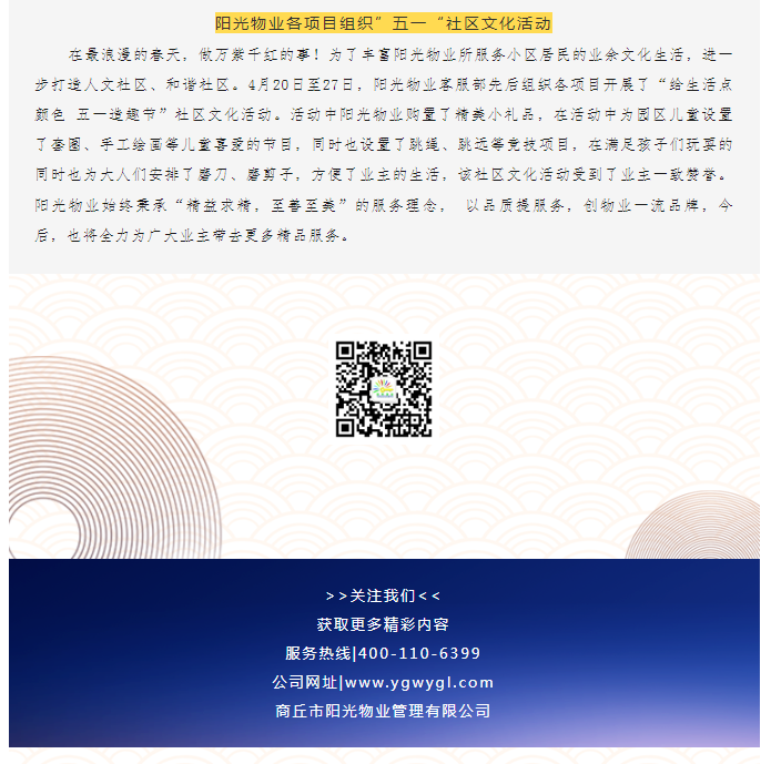 陽(yáng)光物業(yè)成立于2003年5月,專(zhuān)注物業(yè)服務(wù)行業(yè)20余載,陽(yáng)光物業(yè)現(xiàn)為河南省物業(yè)管理協(xié)會(huì)副會(huì)長(zhǎng)單位、商丘市物業(yè)管理協(xié)會(huì)副會(huì)長(zhǎng)單位,公司注冊(cè)資金1020萬(wàn)元,陽(yáng)光物業(yè)連續(xù)多年被河南省及商丘市評(píng)為先進(jìn)企業(yè)、優(yōu)秀企業(yè)。