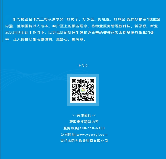 陽(yáng)光物業(yè)成立于2003年5月,專注物業(yè)服務(wù)行業(yè)20余載,陽(yáng)光物業(yè)現(xiàn)為河南省物業(yè)管理協(xié)會(huì)副會(huì)長(zhǎng)單位、商丘市物業(yè)管理協(xié)會(huì)副會(huì)長(zhǎng)單位,公司注冊(cè)資金1020萬(wàn)元,陽(yáng)光物業(yè)連續(xù)多年被河南省及商丘市評(píng)為先進(jìn)企業(yè)、優(yōu)秀企業(yè)。