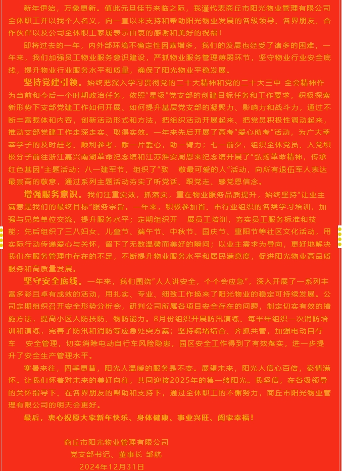 陽(yáng)光物業(yè)成立于2003年5月,專注物業(yè)服務(wù)行業(yè)20余載,陽(yáng)光物業(yè)現(xiàn)為河南省物業(yè)管理協(xié)會(huì)副會(huì)長(zhǎng)單位、商丘市物業(yè)管理協(xié)會(huì)副會(huì)長(zhǎng)單位,公司注冊(cè)資金1020萬(wàn)元,陽(yáng)光物業(yè)連續(xù)多年被河南省及商丘市評(píng)為先進(jìn)企業(yè)、優(yōu)秀企業(yè)。