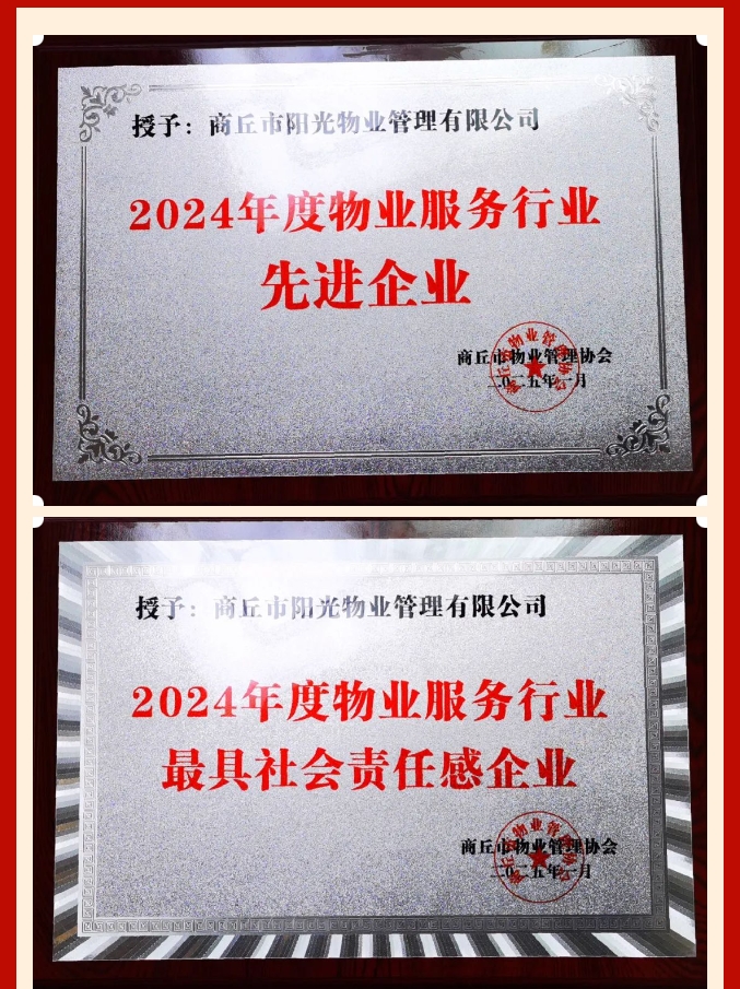 陽光物業(yè)成立于2003年5月,專注物業(yè)服務(wù)行業(yè)20余載,陽光物業(yè)現(xiàn)為河南省物業(yè)管理協(xié)會副會長單位、商丘市物業(yè)管理協(xié)會副會長單位,公司注冊資金1020萬元,陽光物業(yè)連續(xù)多年被河南省及商丘市評為先進企業(yè)、優(yōu)秀企業(yè)。